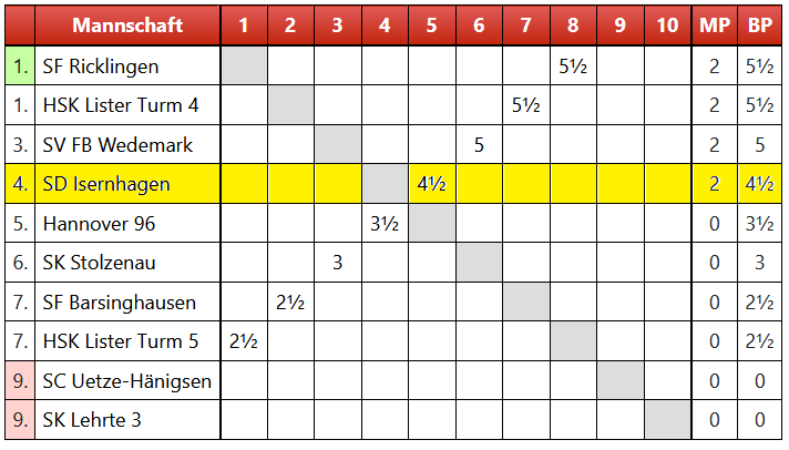 Gegen den späteren Vize Hameln erreichten wir ein beeindruckendes 4-4 und waren dem Sieg näher dran als der Favorit. Gegen die Überraschungsmannschaft aus Lehrte war die 3,5-4,5-Niederlage genau so eng wie das Ergebnis es beschreibt und gegen die Schachtiger und den ESV Göttingen (jeweils 4-4) waren wir auf Kurs die vollen 2 Punkte mitzunehmen. Hätte, hätte, Bauernkette... Doch wenn es nicht lief, dann lief es nicht: Während es am ersten Spieltag gegen Gliesmarode ein standesgemäßes 2-6 hagelte, sahen wir im Heimspiel gegen Gifhorn-Wolfsburg eher "alt als jung" aus (2-6). Aber als es darauf ankam, die wichtigen Punkte zu gewinnen, waren alle hellwach und voll da: Mit den zwei Siegen gegen Rinteln und Ricklingen machten wir an den Spieltagen 6 und 7 den Klassenerhalt praktisch perfekt - vorzeitig! Unsere Topscorer waren Frank (5,5/8), Sven-Henrik (4,5/9) und Apostolos (4/8). Und in Summe auch unsere Ersatzleute (insgesamt 4/7), wobei Kati mit 2/2 nichts anbrennen ließ. Insgesamt eine starke (Über-)Performance von allen! |