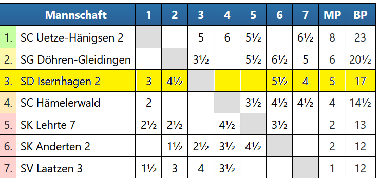Nach einem Jahr Pause musste ich diese Saison an Brett 2 und 3 antreten,ergebnistechnisch lief es jedoch außerordentlich gut. Mit 5,5 aus 8 Punkten bin ich sehr zufrieden, auch wenn der eine oder andere Punkt wohl eher dem Glück als dem Verstand zu verdanken war. Bei einem DWZ-Plus von über 180 in nur einem Jahr kann ich mich allerdings kaum beschweren.